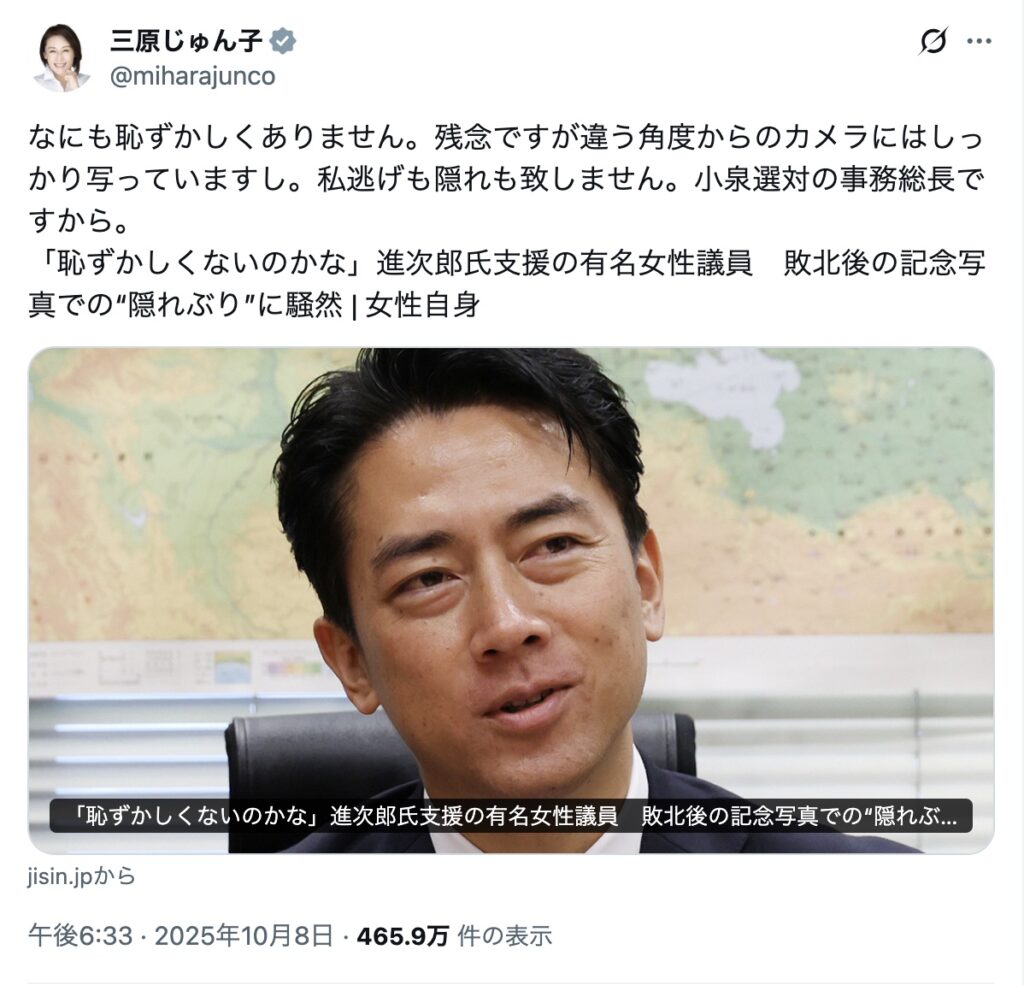 カメラ顔を背ける様子の三原じゅん子がネットで見つかり炎上しました。